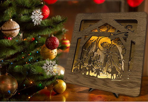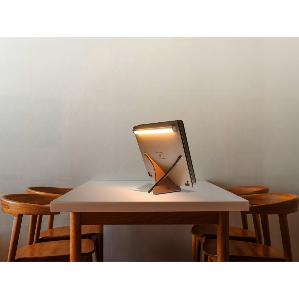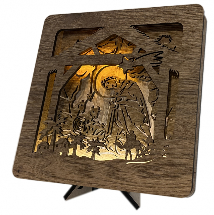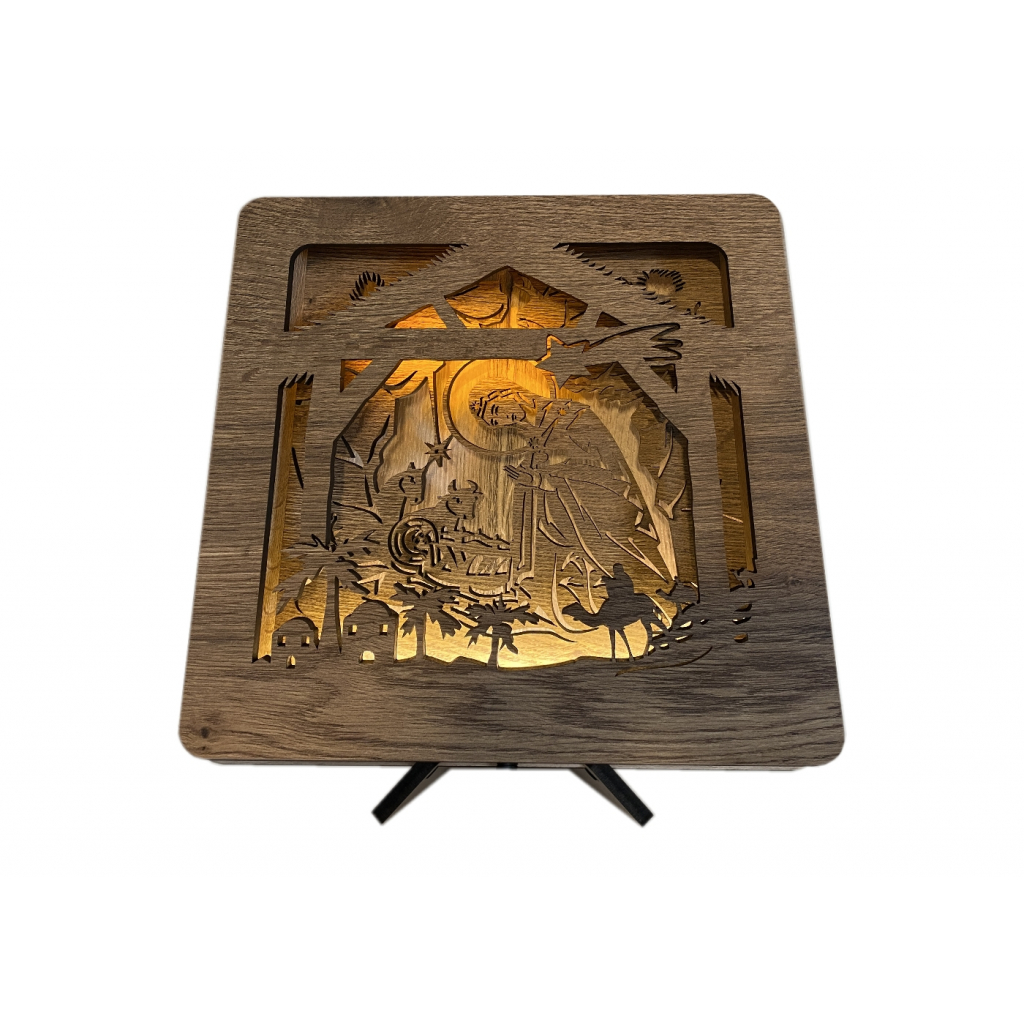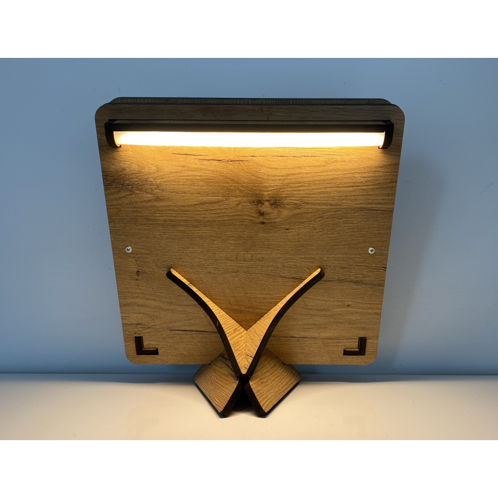 Cuadro-Lámpara de mesita LED con motivo retro-iluminado extra cálido en la parte frontal y luz blanca cálida directa (potente) en la parte posterior. La lámpara está equipada con LED y se alimenta mediante un adaptador de voltaje externo de 12 V conectado a un enchufe.